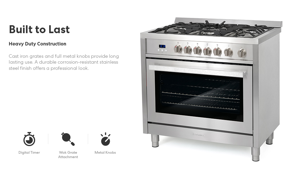 Bring professional quality home with Cosmo's COS-965AGFC 36 inch single oven gas range in stainless steel. Featuring 5 high-performance burners, you can create culinary masterpieces from start to finish. The cooktop is equipped with one 17, 400 BTU triple ring burner, one 8, 200 BTU rapid burner, two 6, 900 BTU semi-rapid burners, and one 5, 000 BTU auxiliary burner, giving you both precision and power for a wide variety of needs. A large 3. 8 cu. ft. oven provides ample space to cook for your whole family. Rapid convection technology delivers superior results by circulating air in the oven cavity to maintain even temperatures throughout- no more cold spots. A built-in display and electronic controls allow you to set the clock and timer for precision cooking.