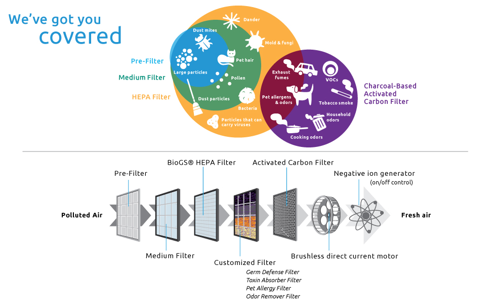 Typical HEPA air purifiers trap allergens and contaminants, which accumulate on the filter and interfere with efficiency. The BioGS HEPA filter traps and reduces common allergens* to support optimum filter efficiency and prolong filter life.