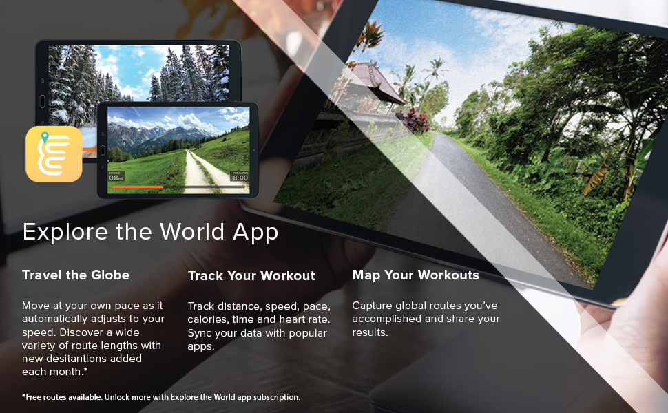 - Explore the world and discover 50plus global routes that auto-adjust in real time to your speed