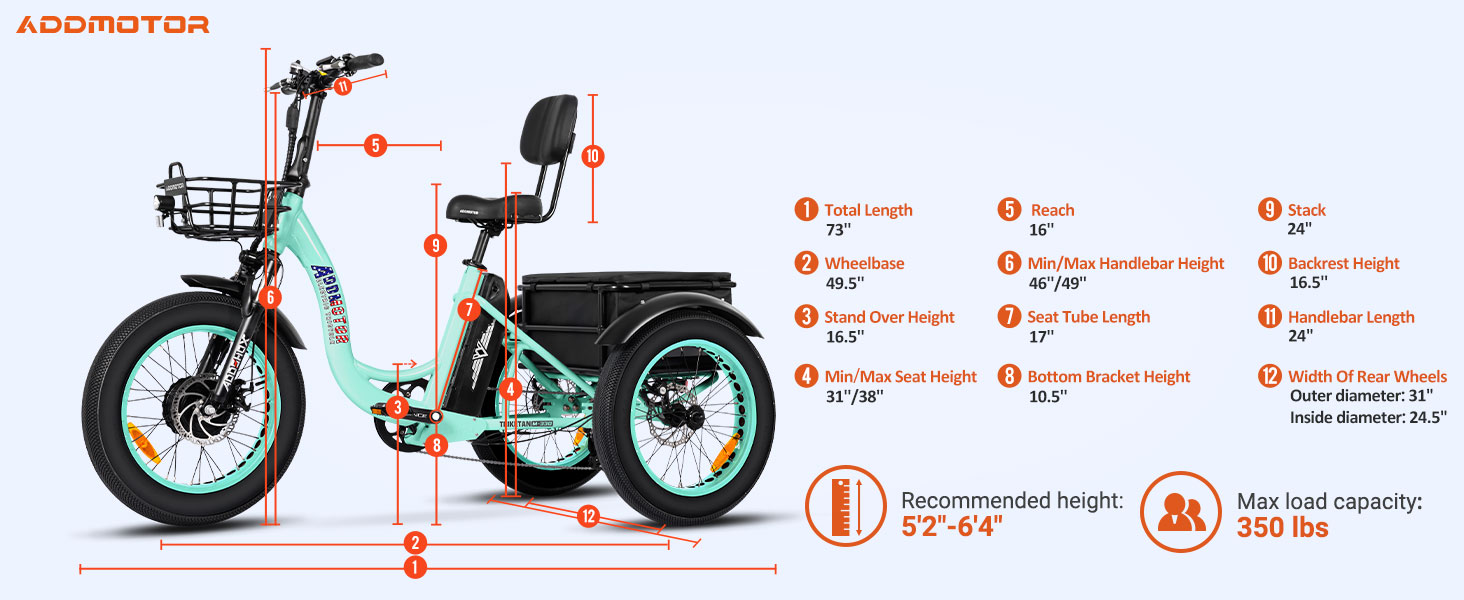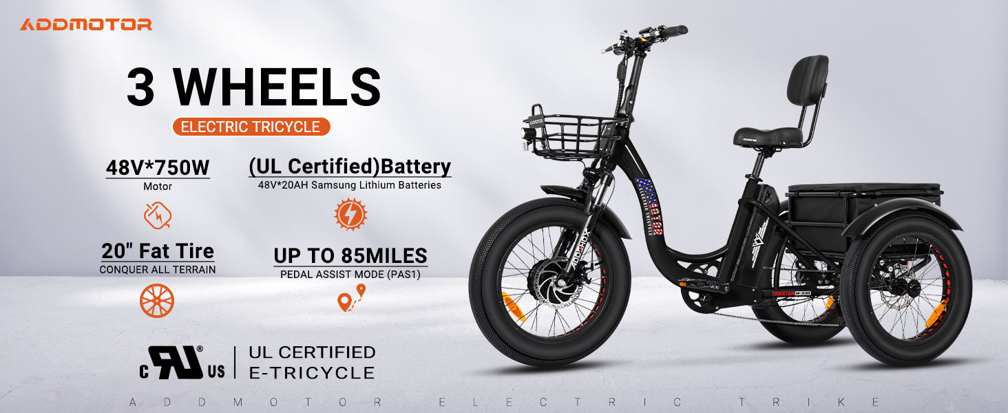 Large Capacity Baskets -----Addmotor electric trike has a front basket and a large rear basket, load up the convenient basket with groceries, supplies, or whatever suits your daily shopping while staying in shape.