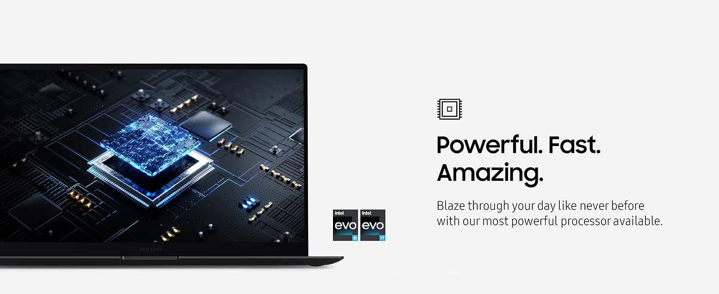 - POWERFUL. FAST. AMAZING: Our new laptop is packed with the premium performance you’ve come to expect from Samsung — plus some; It’s powered by the latest 12th Gen Evo-certified Intel processor. our most powerful available CPU yet