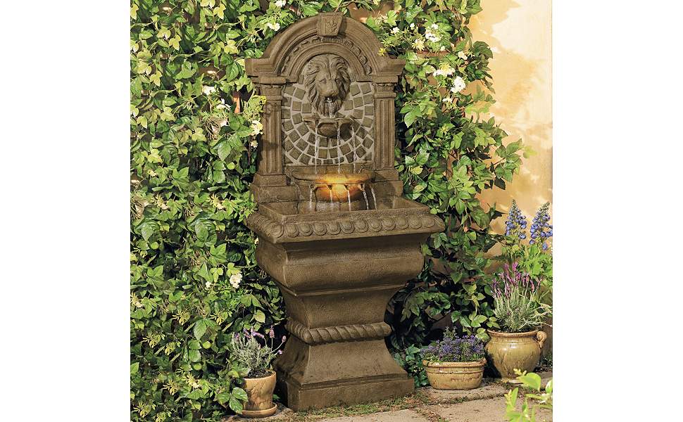 Mediterranean inspired, this traditional fountain with light features flowing water from a lion's head into a series of basins.