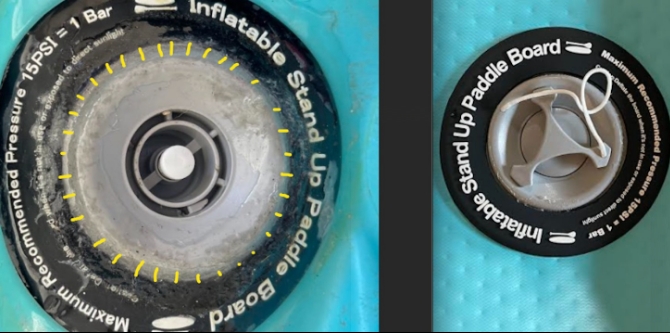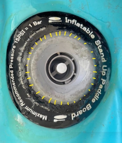 Over all I am truly grateful for the companies integrity for quality and service to their customers, they could have never responded or never replaced the board. I bought this board around the 3rd week of June 2021, I had never owned an inflatable paddle board prior and only been on hard boards. When I received it I pumped it up and it was fine, when I took it out onto the water it started leaking immediately (like i thought the water hurt it) after google, youtube and asking people in the SUP groups online everyone suggested that I tighten the valve with the plastic tightener that it came with. When I did this the tightener broke and so did 1 of the arms inside the valve area. At this point I'm very frustrated because I genuinely just wanted to be on the water I didn't care what it looked like I just wanted to SUP and feel safe. (yellow markings are indicator of space between the valve and the black seal, its kind of hard to see with all the epoxy layered on it and last pic shows the space difference from 1st board and 2nd board) Once inflated I did the test soap and water test where you put a little bit of soap in a cup of water and poor it on the board to see where the leak is coming from. Well It was coming from all around the valve where I have the yellow markings. I tried at least 4 different glues, resin and epoxy all marine and over 3k PSI (1 worked out of the 4 SOLAREZ UV Cure Epoxy) I bought 1 of them for almost $60 from a military store that was for rafts. The issue I was running into was that I did not have a layered on patch for the area as I need to inflate the board. Once I found the epoxy that worked without a layered patch I could still hear air coming out of it.... So I did the soap and water test again, now it was coming out of the string hole that is meant to keep the cap attached to the board, and leaking on the outside of the black seal that touches the blue part of the board. HOW is this possible IDK. So I cut the string and laid epoxy ov