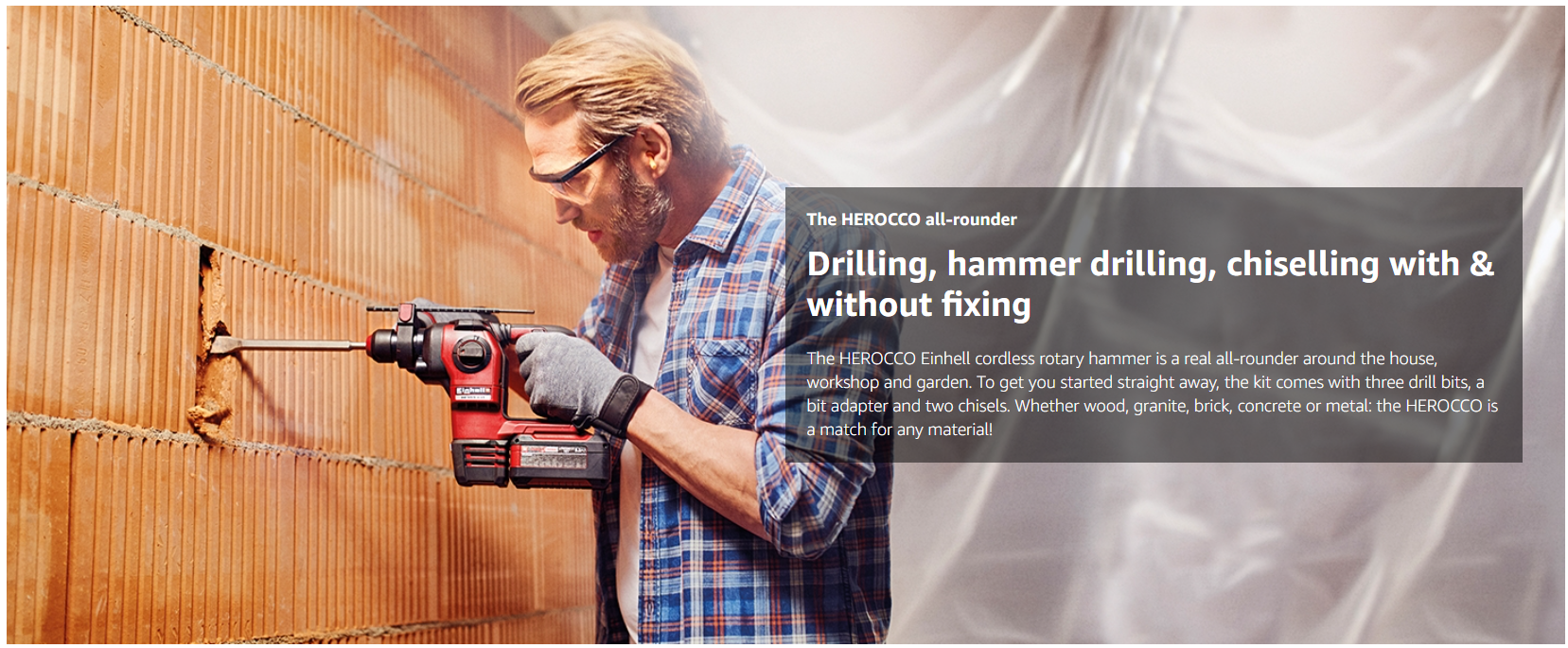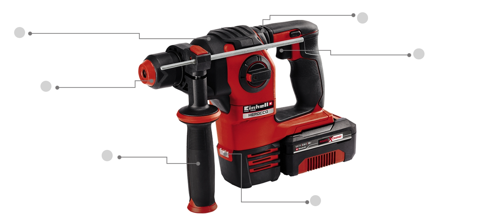 - 4 in 1 - The HEROCCO cordless rotary hammer combines four functions in one device. It can drill, hammer drill and chisel with and without fixing