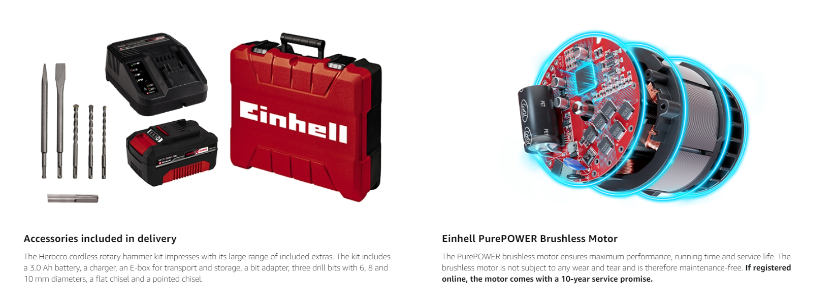Manufacturer Einhell Part Number 4513975 Product Dimensions 27.5 x 20.8 x 10 cm; 2.12 kg Batteries 1 Lithium Ion batteries required. (included) Item model number HEROCCO Size 2.2 joules Colour Black Style Drill With Battery & Charger Power Source Battery Powered Voltage 18 Volts Maximum power 650 Watts Torque 18 Newton Meters Item Package Quantity 1 Number of Pieces 1 Special Features Adjustable Speed Control, Cordless, Brush Included Components Cordless rotary hammer, 3.0 Ah PXC battery, charger, 3 drill bits, flat chisel, pointed chisel, E-box Batteries included? Yes Batteries Required? Yes Battery Cell Type Lithium Ion Battery Capacity 8 Milliamp Hours Item Weight 2.12 kg