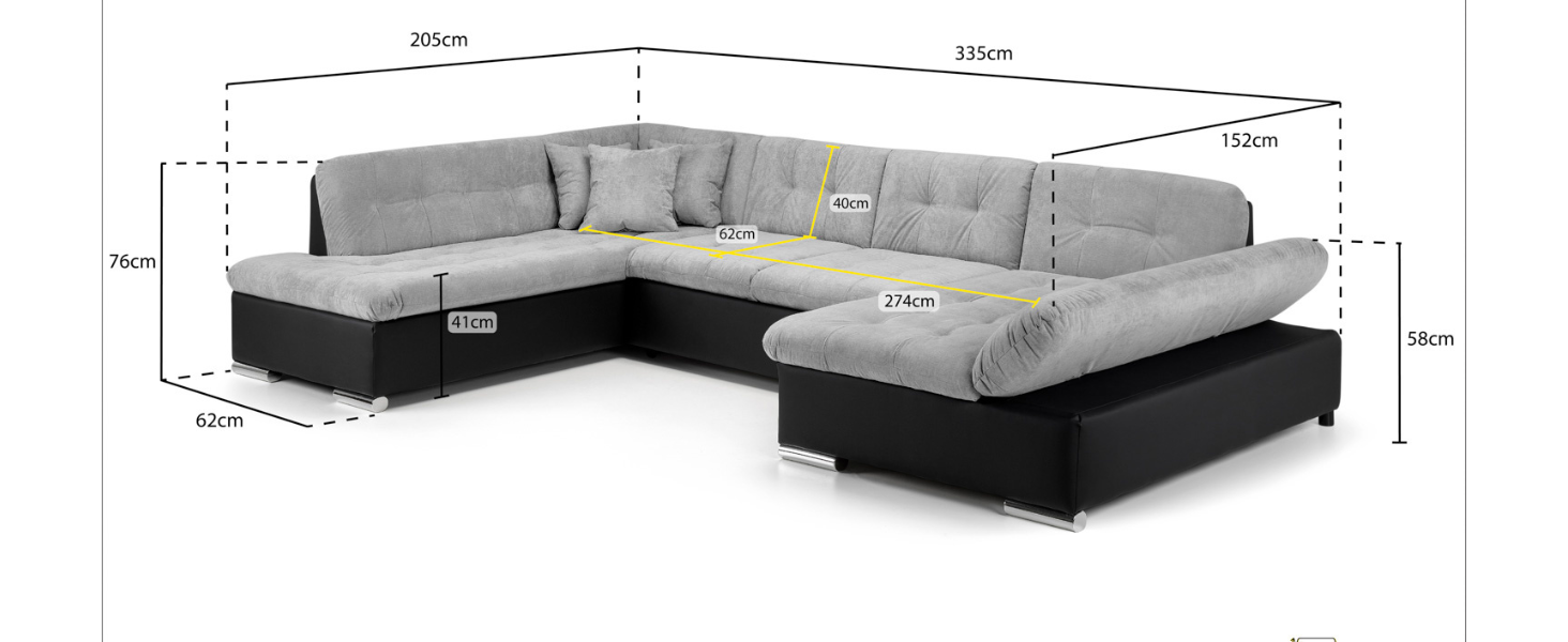 • 【DIMENSIONS】Length 335x205x152 cm – Depth 62 cm – Height 76 cm – Double Sofabed Sleeping Area 302x128 cm (more measurements are in the sofa dimensions image)