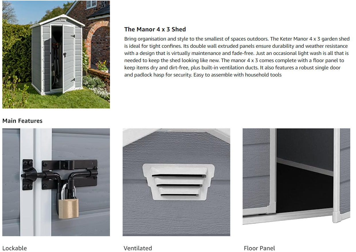 Keter Manor Outdoor Garden Storage Shed, Grey, 4 x 3 ft